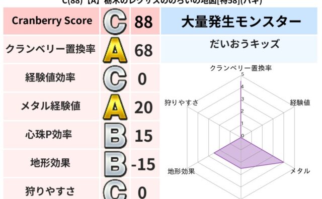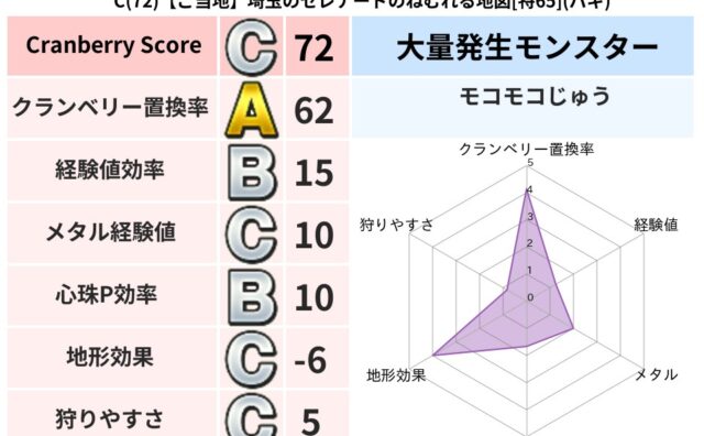 クランベリーボット判定結果の詳細クランベリースコア:87クランベリー置換率:62%大量発生モンスター:モコモコじゅうバギ超耐性(50%)こころ道 完全一致モンスターヘルボックル魔剣士(魔道Lv30)デビルアーマー大神官(舞道Lv5)モコモコ...