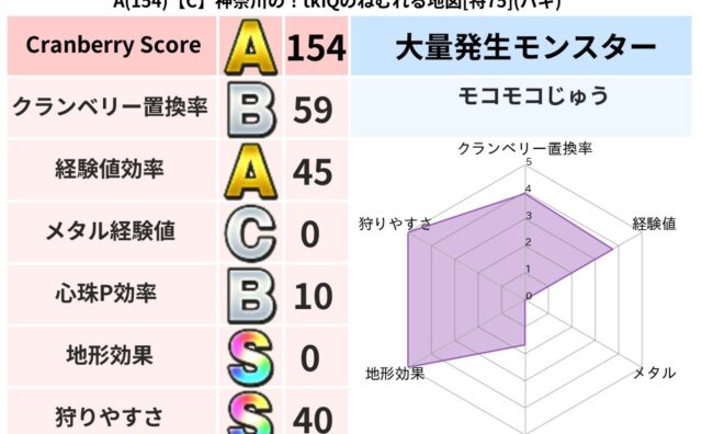 クランベリーボット判定結果の詳細クランベリースコア136クランベリー置換率36%超耐性バギ(0%)超耐性・弱耐性なしドルマこころ道 完全一致モンスターどくろあらいゴッドハンド(守護道Lv5)みならいあくまニンジャ(風道Lv5)キースドラゴン...