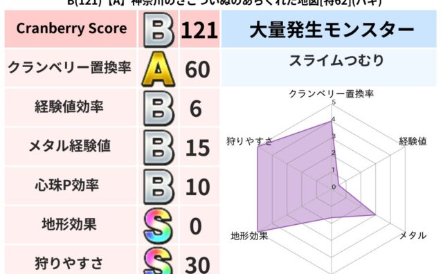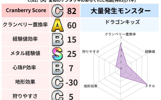 クランベリーボット判定結果の詳細クランベリースコア:116クランベリー置換率:68%大量発生モンスター:じごくのもんばんバギ超耐性(0%)系統狩り(45%)こころ道 完全一致モンスターかっちゅうアリ: 魔人(共通Lv1)リカントマムル: ド...