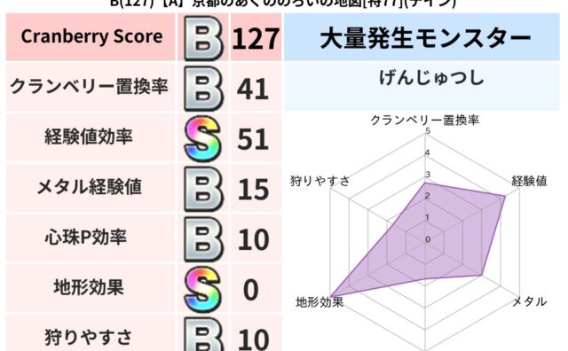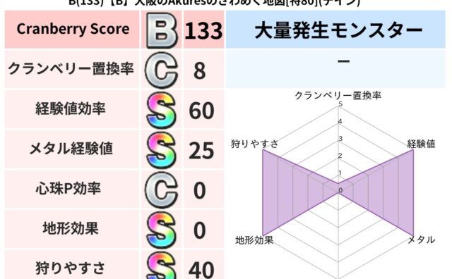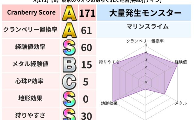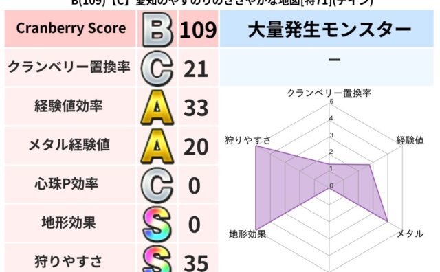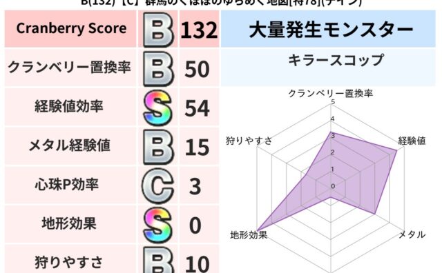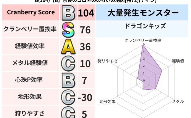 クランベリーボット判定結果の詳細クランベリースコア104クランベリー置換率76%大量発生モンスタードラゴンキッズ超耐性デイン(41%)超耐性・弱耐性なしドルマ系統狩りドラゴン系43%こころ道 完全一致モンスタードロヌーバニンジャ(波道Lv5...
