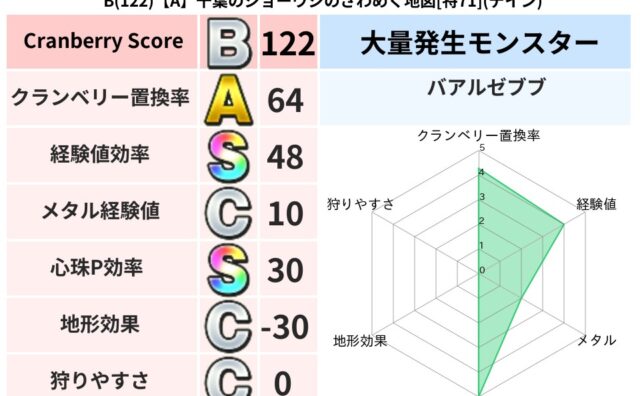 クランベリーボット判定結果の詳細クランベリースコア:122クランベリー置換率:64%大量発生モンスター:バアルゼブブデイン超耐性(69%)こころ道 完全一致モンスターみならいあくまニンジャ(風道Lv5)くさった死体ゴッドハンド(守護道Lv5...
