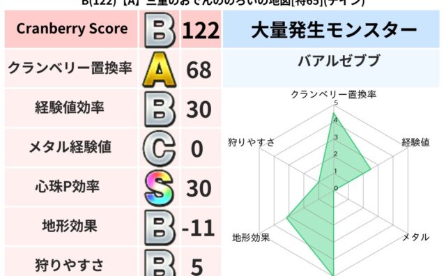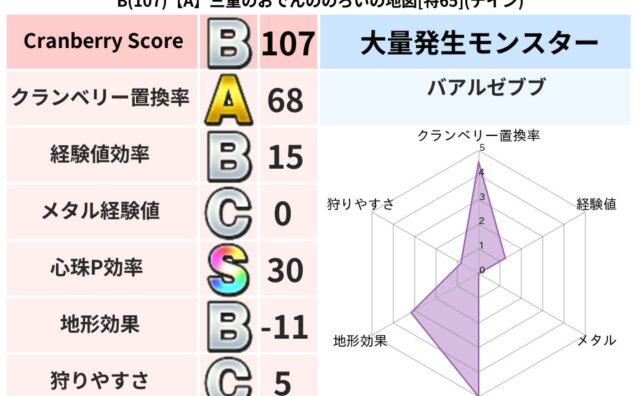クランベリーボット判定結果の詳細クランベリースコア:122クランベリー置換率:68%大量発生モンスター:バアルゼブブデイン超耐性(9%)超耐性・弱耐性なし:バギこころ道 完全一致モンスターヘルボックル魔剣士(魔道Lv30)ストーンマンゴッド...