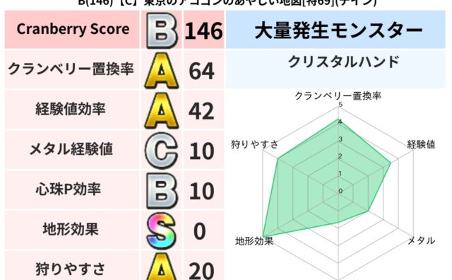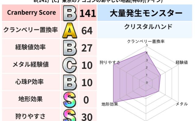 クランベリーボット判定結果の詳細クランベリースコア:161クランベリー置換率:64%大量発生モンスター:クリスタルハンドデイン超耐性(0%)こころ道 完全一致モンスターおおさそり: ゴッドハンド(武道Lv5),ドラゴン(共通Lv1)リカント...