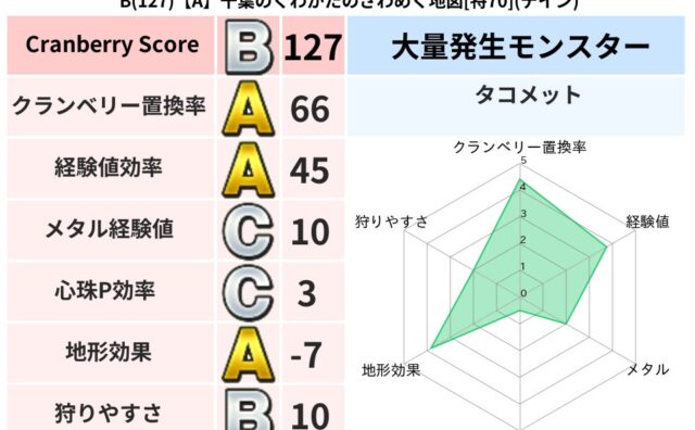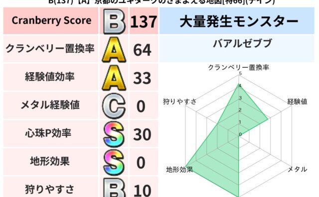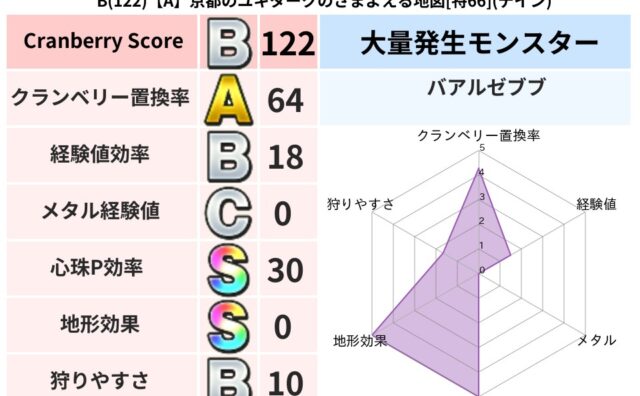 クランベリーボット判定結果の詳細クランベリースコア122クランベリー置換率64%大量発生モンスターバアルゼブブ超耐性デイン(0%)こころ道 完全一致モンスターヒートギズモ守り人(ささえ道Lv5)キースドラゴン大魔道士(理力道Lv5)ミニデー...