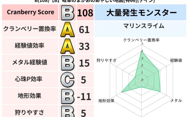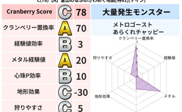 クランベリーボット判定結果の詳細クランベリースコア:117クランベリー置換率:19%大量発生モンスター:おばけトマトデイン超耐性(0%)超耐性・弱耐性なし:バギ