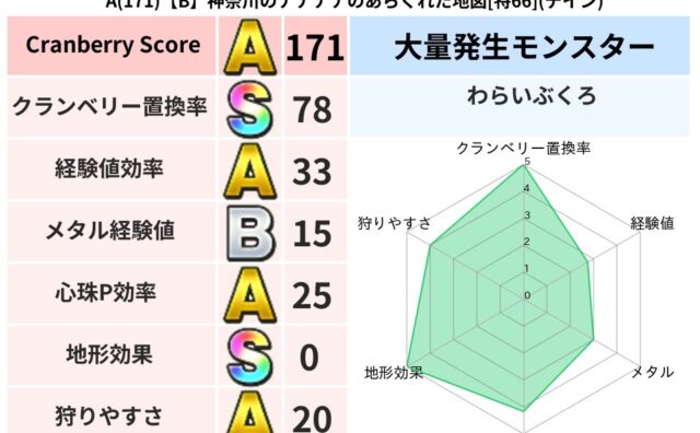 クランベリーボット判定結果の詳細クランベリースコア:186クランベリー置換率:78%大量発生モンスター:わらいぶくろデイン超耐性(0%)こころ道 完全一致モンスターキースドラゴン: 大魔導士(理力道Lv5)ナイトキャット: 守り人(まもり道...