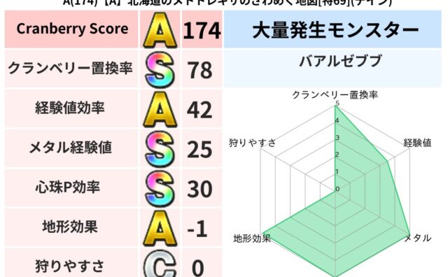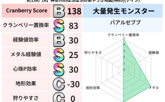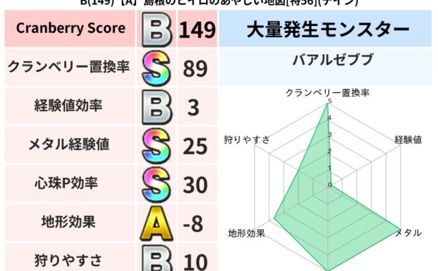 クランベリーボット判定結果の詳細クランベリースコア:157クランベリー置換率:44%大量発生モンスター:マッドフィンガーデイン超耐性(0%)系統狩り(53%)こころ道 完全一致モンスターさまようよろい: ゴッドハンド(守護道Lv5)ストーン...