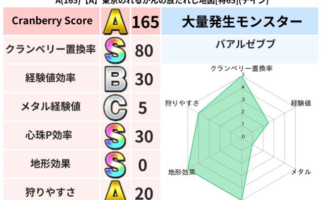 クランベリーボット判定結果の詳細クランベリースコア149クランベリー置換率89%大量発生モンスターバアルゼブブ超耐性デイン(7%)系統狩り虫系48%こころ道 完全一致モンスターかっちゅうアリ魔人(共通Lv1)てつのさそりゴッドハンド(守護道...