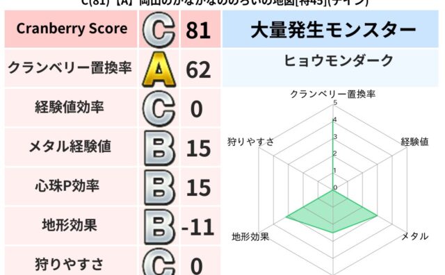 地図判定結果 C(81)【A】岡山のかなかなののろいの地図[特45](デイン) クランベリーボット判定結果の詳細クランベリースコア:81クランベリー置換率:62%大量発生モンスター:ヒョウモンダークデイン超耐性(9%)こころ道 完全一致モンスターばくだん岩大神官(舞道Lv5)てつのさそりゴッドハンド(守護道Lv5),大... 2023/11/30 21:05 地図判定結果