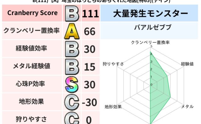 クランベリーボット判定結果の詳細クランベリースコア96クランベリー置換率66%大量発生モンスターバアルゼブブ超耐性デイン(46%)こころ道 完全一致モンスターどくどくゾンビ魔剣士(共通Lv1)シャドーニンジャ(波道Lv30)かっちゅうアリ魔...