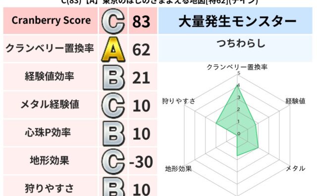 クランベリーボット判定結果の詳細クランベリースコア:114クランベリー置換率:67%大量発生モンスター:モコモコじゅうデイン超耐性(0%)こころ道 完全一致モンスタードロヌーバ: ニンジャ(波道Lv5)ブラウニー: 守り人(共通Lv1)デビ...