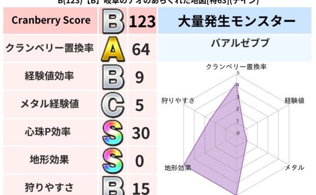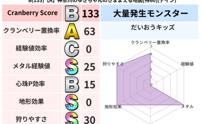 クランベリーボット判定結果の詳細クランベリースコア:150クランベリー置換率:42%大量発生モンスター:しびれだんびらデイン超耐性(0%)系統狩り(52%)こころ道 完全一致モンスターどくイモムシ: ニンジャ(波道Lv5)しびれだんびら: ...