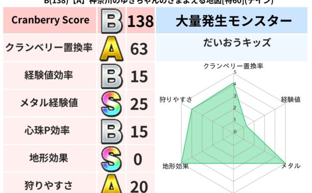 クランベリーボット判定結果の詳細クランベリースコア:138クランベリー置換率:63%大量発生モンスター:だいおうキッズデイン超耐性(0%)こころ道 完全一致モンスターヒートギズモ守り人(ささえ道Lv5)メイジキメラゴッドハンド(武道Lv10...
