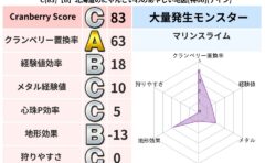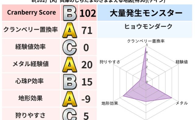クランベリーボット判定結果の詳細クランベリースコア144クランベリー置換率69%大量発生モンスターわらいぶくろ超耐性デイン(0%)系統狩り物質系44%こころ道 完全一致モンスターさまようよろいゴッドハンド(守護道Lv5)かっちゅうアリ魔人(...