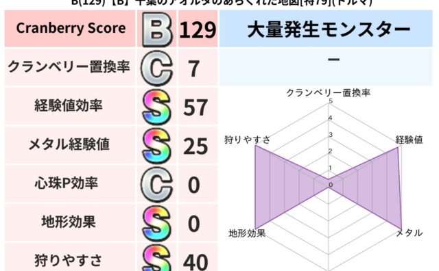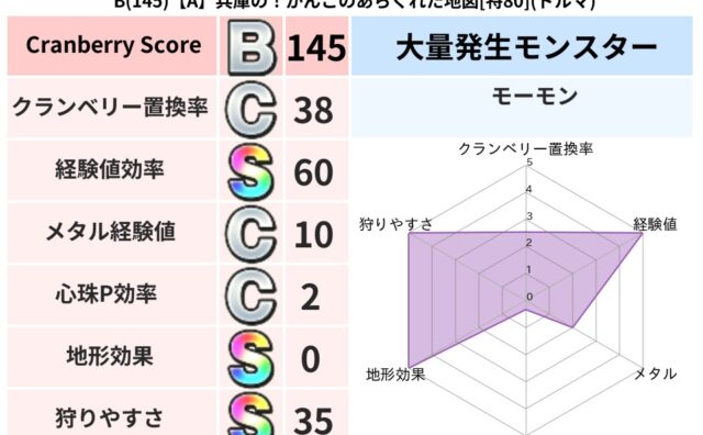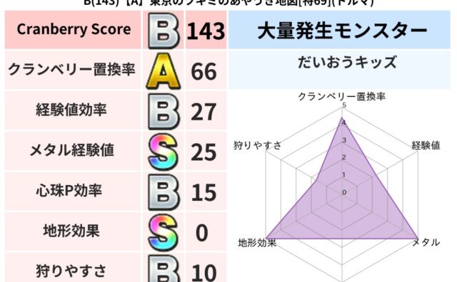 クランベリーボット判定結果の詳細クランベリースコア143クランベリー置換率66%大量発生モンスターだいおうキッズ超耐性ドルマ(0%)こころ道 完全一致モンスターどくイモムシニンジャ(波道Lv5)フレイム守り人(ささえ道Lv5)かっちゅうアリ...