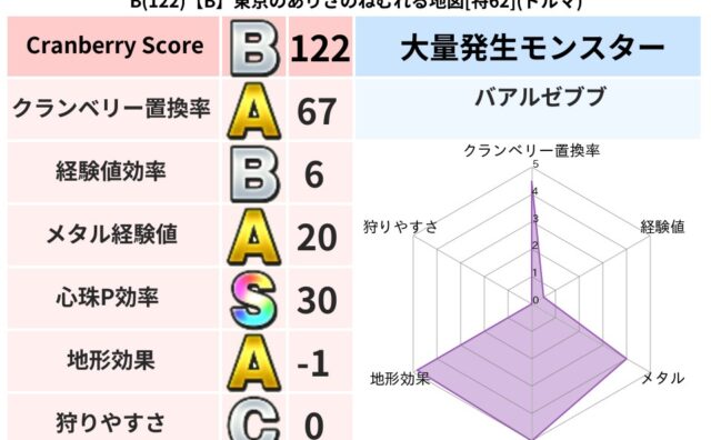 クランベリーボット判定結果の詳細クランベリースコア122クランベリー置換率67%大量発生モンスターバアルゼブブ超耐性ドルマ(1%)系統狩り悪魔系40%こころ道 完全一致モンスターストーンマンゴッドハンド(守護道Lv5)つかいま大魔道士(理力...