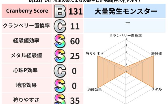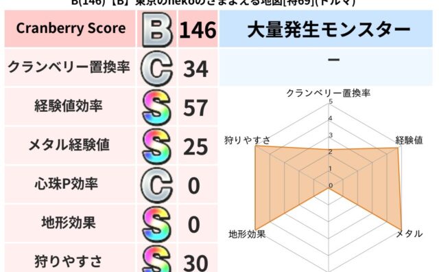 クランベリーボット判定結果の詳細クランベリースコア95クランベリー置換率60%大量発生モンスターさそりばち超耐性ドルマ(52%)こころ道 完全一致モンスターベロニャーゴ大魔道士(理力道Lv5)キースドラゴン大魔道士(理力道Lv5)さそりばち...