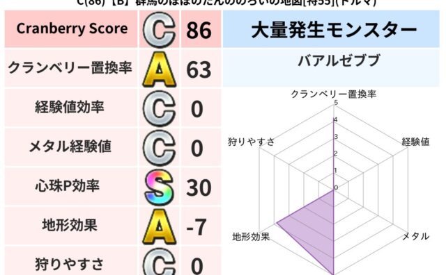 クランベリーボット判定結果の詳細クランベリースコア:141クランベリー置換率:45%大量発生モンスター:わらいぶくろドルマ超耐性(0%)超耐性・弱耐性なし:イオ