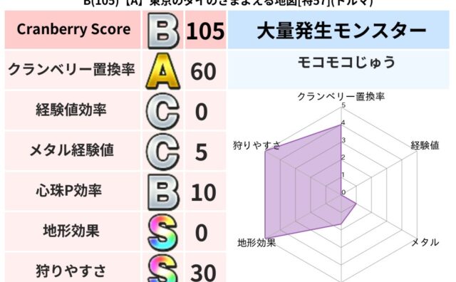 クランベリーボット判定結果の詳細クランベリースコア:127クランベリー置換率:79%大量発生モンスター:じごくのもんばんドルマ超耐性(48%)超耐性・弱耐性なし:バギ系統狩り(49%)こころ道 完全一致モンスターデビルアーマー大神官(舞道L...
