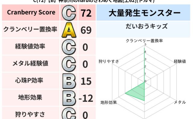 地図判定結果 C(86)【A】静岡のハナコのあやしい地図[特58](ドルマ) クランベリーボット判定結果の詳細クランベリースコア:86クランベリー置換率:68%大量発生モンスター:リリパットドルマ超耐性(0%)系統狩り(52%)こころ道 完全一致モンスターしりょうのきし: 大神官(舞道Lv5)かっちゅうアリ: 魔人(... 2024/02/05 21:43 地図判定結果