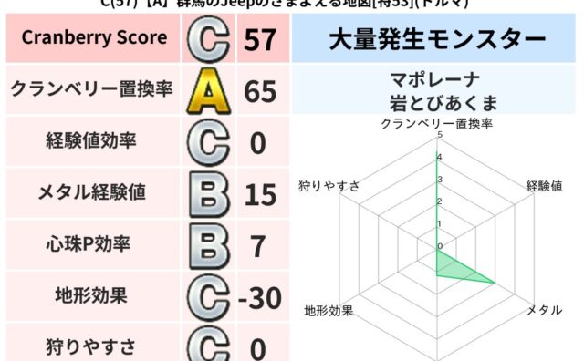 地図判定結果 C(72)【A】群馬のJeepのさまよえる地図[特53](ドルマ) クランベリーボット判定結果の詳細クランベリースコア:72クランベリー置換率:65%大量発生モンスター:マポレーナ,岩とびあくまドルマ超耐性(0%)こころ道 完全一致モンスターしのどれい: ゴッドハンド(守護道Lv5),大魔導士(魔力道Lv5... 2024/01/08 19:34 地図判定結果