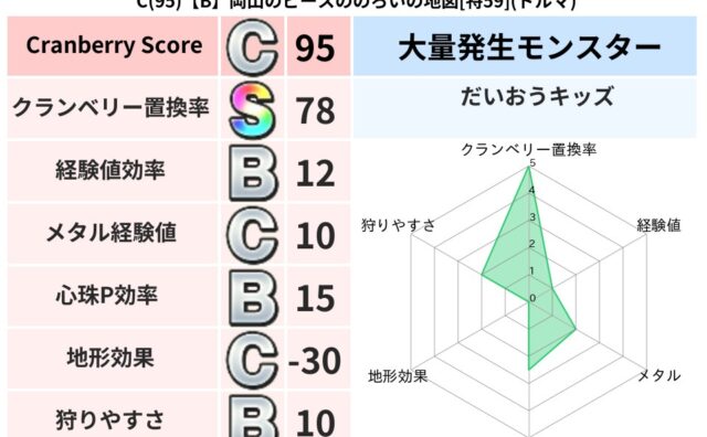 地図判定結果 C(95)【B】岡山のピースののろいの地図[特59](ドルマ) クランベリーボット判定結果の詳細クランベリースコア:95クランベリー置換率:78%大量発生モンスター:だいおうキッズドルマ超耐性(47%)こころ道 完全一致モンスターどれいへいしドラゴン(人道Lv5)フレイム守り人(ささえ道Lv5)かっちゅ... 2024/01/06 12:15 地図判定結果置換率S