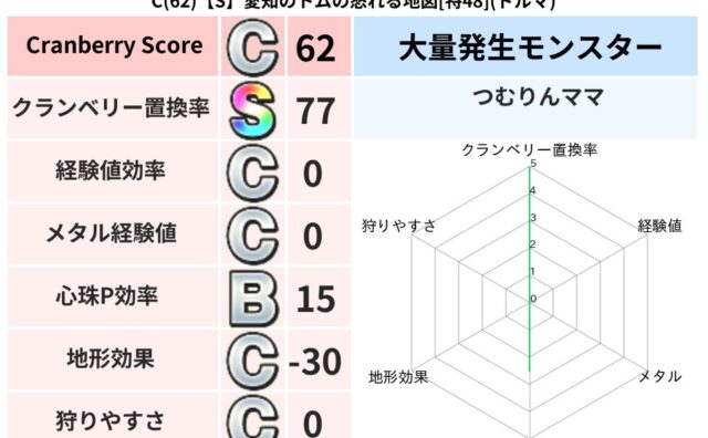 地図判定結果 C(68)【S】愛知のトムの怒れる地図[特48](ドルマ) クランベリーボット判定結果の詳細クランベリースコア:68クランベリー置換率:77%大量発生モンスター:つむりんママドルマ超耐性(0%)こころ道 完全一致モンスターデビルアーマー: 大神官(舞道Lv5)ばくだん岩: 大神官(舞道Lv5)つかい... 2024/01/15 17:11 地図判定結果置換率S
