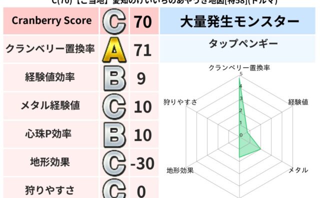 地図判定結果 C(70)【ご当地】愛知のけいいちのあやうき地図[特58](ドルマ) クランベリーボット判定結果の詳細クランベリースコア:70クランベリー置換率:71%大量発生モンスター:タップペンギードルマ超耐性(54%)こころ道 完全一致モンスターしのどれいゴッドハンド(守護道Lv5),大魔導士(魔力道Lv5)どれいへい... 2023/12/10 10:23 地図判定結果