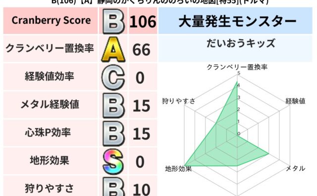 地図判定結果 B(115)【S】静岡のろとの放たれし地図[特49](ドルマ) クランベリーボット判定結果の詳細クランベリースコア:115クランベリー置換率:66%大量発生モンスター:わらいぶくろドルマ超耐性(0%)系統狩り(40%)こころ道 完全一致モンスターギズモ天地雷鳴士(共通Lv1)ばくだん岩大神官(舞道Lv5... 2024/01/02 00:33 地図判定結果