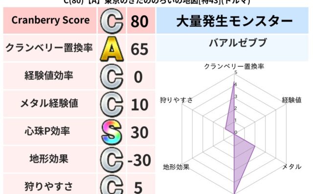 クランベリーボット判定結果の詳細クランベリースコア:61クランベリー置換率:65%大量発生モンスター:タコメットドルマ超耐性(52%)こころ道 完全一致モンスターギズモ天地雷鳴士(共通Lv1)ヒートギズモ守り人(ささえ道Lv5)てつのさそり...