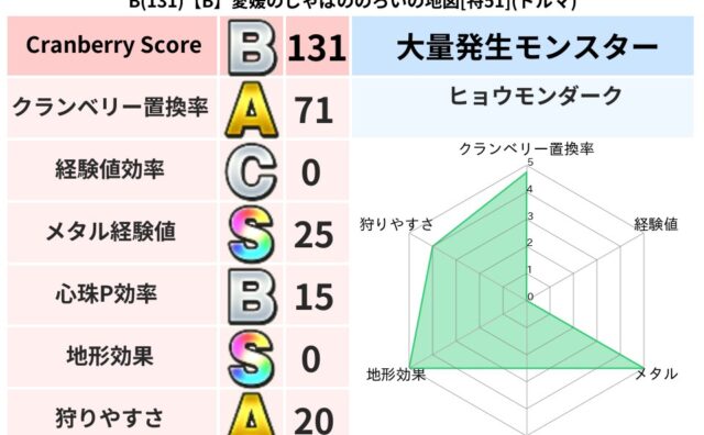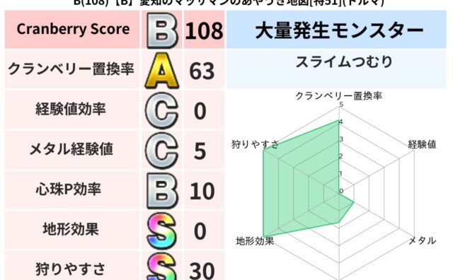 クランベリーボット判定結果の詳細クランベリースコア141クランベリー置換率71%大量発生モンスターヒョウモンダーク超耐性ドルマ(0%)こころ道 完全一致モンスターブラウニー守り人(共通Lv1)ストーンマンゴッドハンド(守護道Lv5)つかいま...