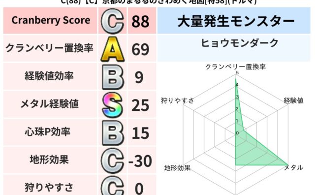 クランベリーボット判定結果の詳細クランベリースコア:88クランベリー置換率:69%大量発生モンスター:ヒョウモンダークドルマ超耐性(49%)こころ道 完全一致モンスターキースドラゴン大魔導士(理力道Lv5)しのさそり大神官(祈道Lv10),...