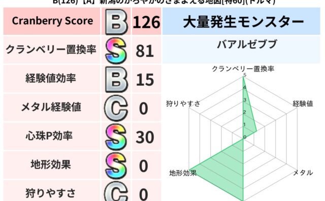 クランベリーボット判定結果の詳細クランベリースコア:126クランベリー置換率:81%大量発生モンスター:バアルゼブブドルマ超耐性(0%)こころ道 完全一致モンスタードロヌーバニンジャ(波道Lv5)かっちゅうアリ魔人(共通Lv1)リカントマム...