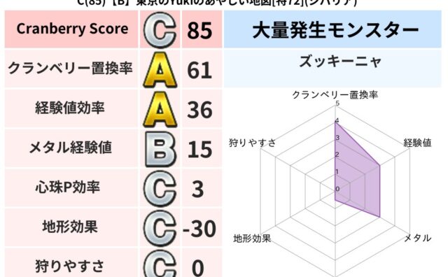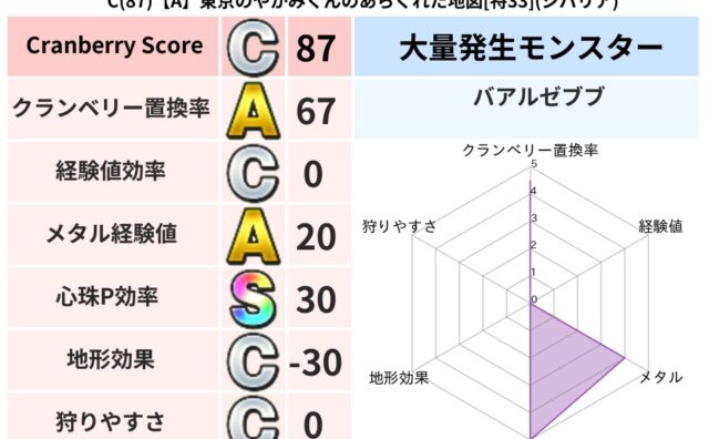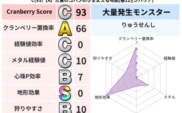 クランベリーボット判定結果の詳細クランベリースコア93クランベリー置換率66%大量発生モンスターりゅうせんし超耐性ジバリア(0%)こころ道 完全一致モンスターしのどれいゴッドハンド(守護道Lv5)大魔道士(魔力道Lv5)ギズモ天地雷鳴士(共...