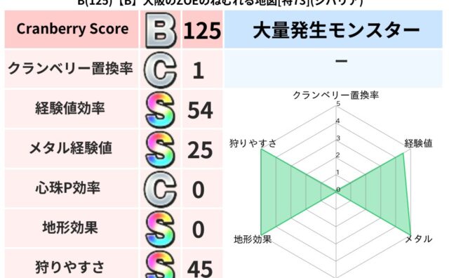 クランベリーボット判定結果の詳細クランベリースコア:85クランベリー置換率:63%大量発生モンスター:メトロゴーストジバリア超耐性(71%)超耐性・弱耐性なし:デインこころ道 完全一致モンスターヒートギズモ守り人(ささえ道Lv5)メトロゴー...