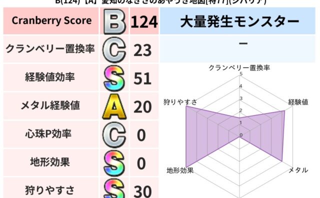 クランベリーボット判定結果の詳細クランベリースコア124クランベリー置換率23%超耐性ジバリア(0%)こころ道 完全一致モンスターベホイミスライム魔剣士(刃道Lv5)アイアンクック守り人(まもり道Lv5)ドロルメイジ大魔道士(魔力道Lv10...