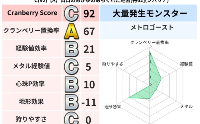 クランベリーボット判定結果の詳細クランベリースコア:92クランベリー置換率:67%大量発生モンスター:メトロゴーストジバリア超耐性(9%)こころ道 完全一致モンスターデビルアーマー大神官(舞道Lv5)だいまどうゴッドハンド(武道Lv40)ナ...