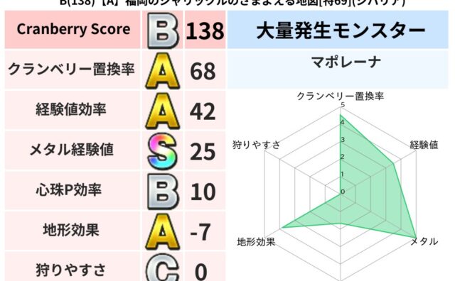 クランベリーボット判定結果の詳細クランベリースコア123クランベリー置換率68%大量発生モンスターマポレーナ超耐性ジバリア(6%)こころ道 完全一致モンスターしのどれいゴッドハンド(守護道Lv5)大魔道士(魔力道Lv5)がいこつ魔剣士(共通...