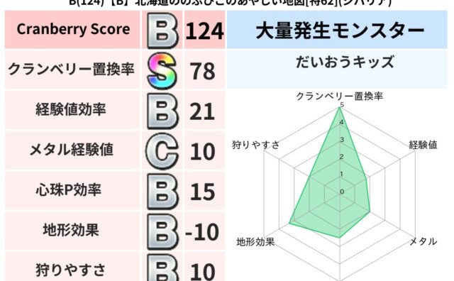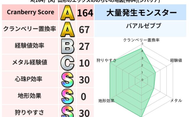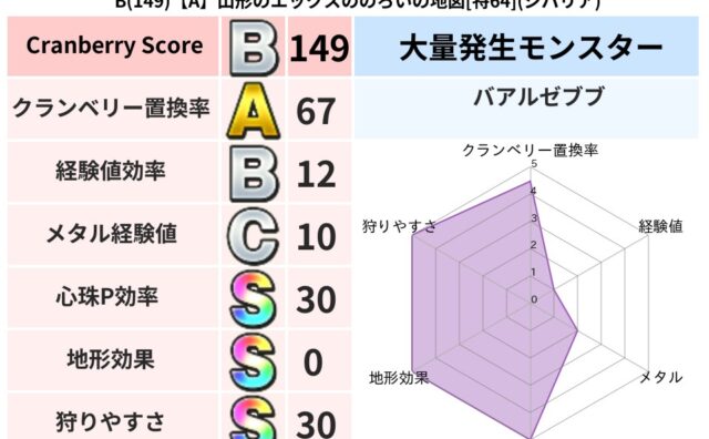クランベリーボット判定結果の詳細クランベリースコア:100クランベリー置換率:65%大量発生モンスター:さそりばちジバリア超耐性(69%)こころ道 完全一致モンスターばくだん岩大神官(舞道Lv5)びっくりサタン大神官(共通Lv1)さそりばち...