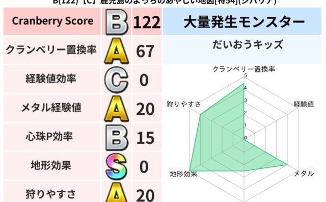 地図判定結果 B(122)【C】鹿児島のよっちのあやしい地図[特54](ジバリア) クランベリーボット判定結果の詳細クランベリースコア:122クランベリー置換率:67%大量発生モンスター:だいおうキッズジバリア超耐性(0%)こころ道 完全一致モンスターねこまどうニンジャ(風道Lv5)どれいへいしドラゴン(人道Lv5)グリゴ... 2023/11/28 17:38 地図判定結果