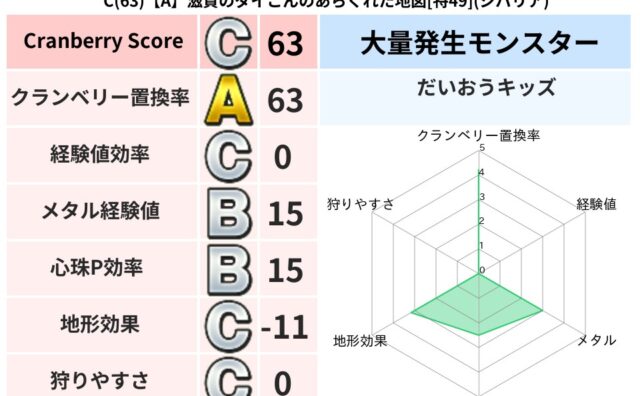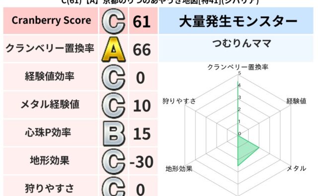 地図判定結果 C(94)【A】滋賀のダイこんのあらくれた地図[特49](ジバリア) クランベリーボット判定結果の詳細クランベリースコア:94クランベリー置換率:63%大量発生モンスター:だいおうキッズジバリア超耐性(0%)こころ道 完全一致モンスターてつのさそり: ゴッドハンド(守護道Lv5),大魔導士(魔力道Lv5)スト... 2023/12/03 12:21 地図判定結果