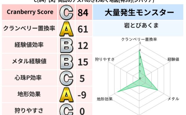 地図判定結果 C(84)【A】岡山のアスハのざわめく地図[特59](ジバリア) クランベリーボット判定結果の詳細クランベリースコア:84クランベリー置換率:61%大量発生モンスター:岩とびあくまジバリア超耐性(7%)こころ道 完全一致モンスターヘルボックル魔剣士(魔道Lv30)ストーンマンゴッドハンド(守護道Lv5)ド... 2023/12/01 19:18 地図判定結果