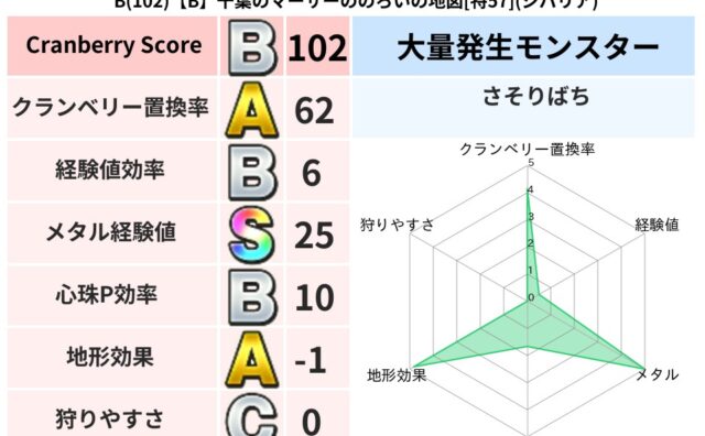 クランベリーボット判定結果の詳細クランベリースコア:102クランベリー置換率:62%大量発生モンスター:さそりばちジバリア超耐性(1%)こころ道 完全一致モンスターキメラ大魔導士(共通Lv1)デビルアーマー大神官(舞道Lv5)グリゴンダンス...
