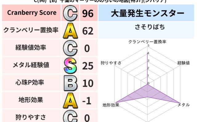 クランベリーボット判定結果の詳細クランベリースコア96クランベリー置換率62%大量発生モンスターさそりばち超耐性ジバリア(1%)こころ道 完全一致モンスターキメラ大魔道士(共通Lv1)デビルアーマー大神官(舞道Lv5)グリゴンダンス魔人(超...