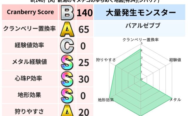 クランベリーボット判定結果の詳細クランベリースコア148クランベリー置換率64%大量発生モンスターわらいぶくろ超耐性ジバリア(0%)こころ道 完全一致モンスターねこまどうニンジャ(風道Lv5)びっくりサタン大神官(共通Lv1)スマイルロック...