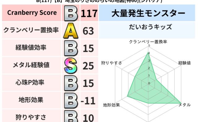 クランベリーボット判定結果の詳細クランベリースコア:117クランベリー置換率:63%大量発生モンスター:だいおうキッズジバリア超耐性(9%)こころ道 完全一致モンスターキースドラゴン大魔導士(理力道Lv5)ナイトキャット守り人(まもり道Lv...