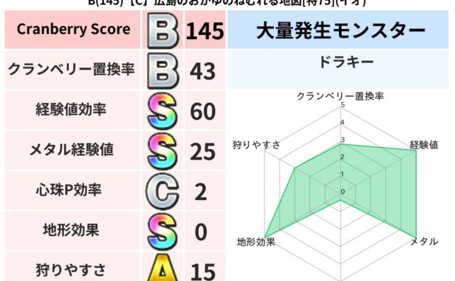 クランベリーボット判定結果の詳細クランベリースコア147クランベリー置換率38%大量発生モンスタードラキー超耐性デイン(0%)系統狩り鳥系51%こころ道 完全一致モンスタードラキー大魔道士(共通Lv1)ストーンマンゴッドハンド(守護道Lv5...