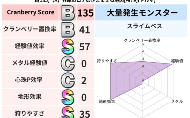 クランベリーボット判定結果の詳細クランベリースコア135クランベリー置換率41%大量発生モンスタースライムベス超耐性ドルマ(0%)超耐性・弱耐性なしバギこころ道 完全一致モンスターストーンマンゴッドハンド(守護道Lv5)スライムベスゴッドハ...