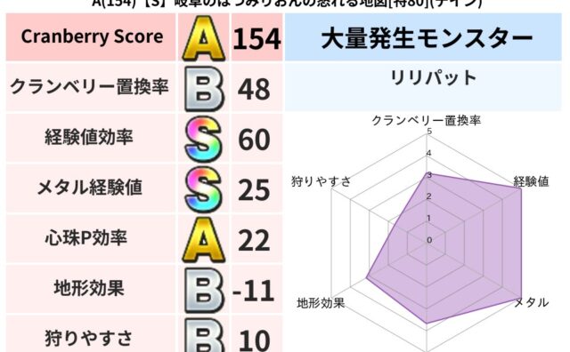 クランベリーボット判定結果の詳細クランベリースコア136クランベリー置換率67%大量発生モンスターリリパット超耐性ギラ(9%)超耐性・弱耐性なしヒャドデインドルマこころ道 完全一致モンスターナイトキャット守り人(まもり道Lv30)キメラ大魔...