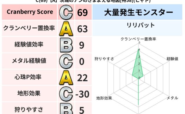 クランベリーボット判定結果の詳細クランベリースコア159クランベリー置換率52%大量発生モンスターリリパット超耐性デイン(0%)こころ道 完全一致モンスターキメラ大魔道士(共通Lv1)しのどれいゴッドハンド(守護道Lv5)大魔道士(魔力道L...